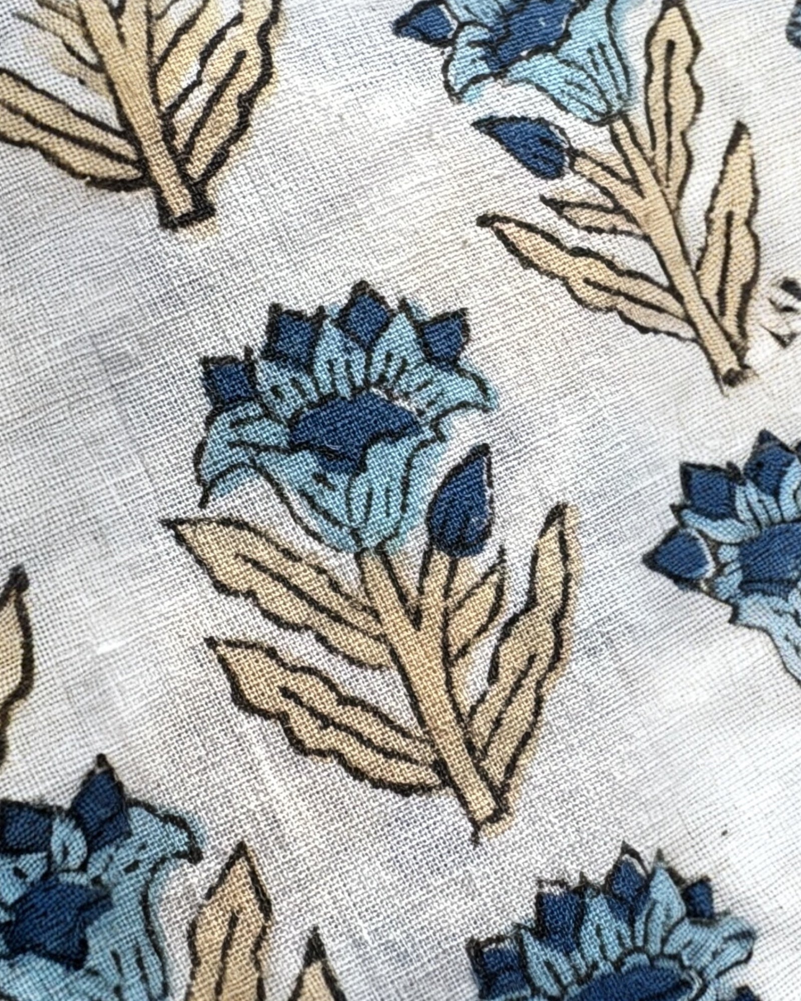 This set features hand screen printing, done by skilled artisans of Rajasthan, India. Made in Jaipur, the process involves using fine mesh screens and vibrant dyes to create detailed patterns on fabric, requiring precision and expert craftsmanship.