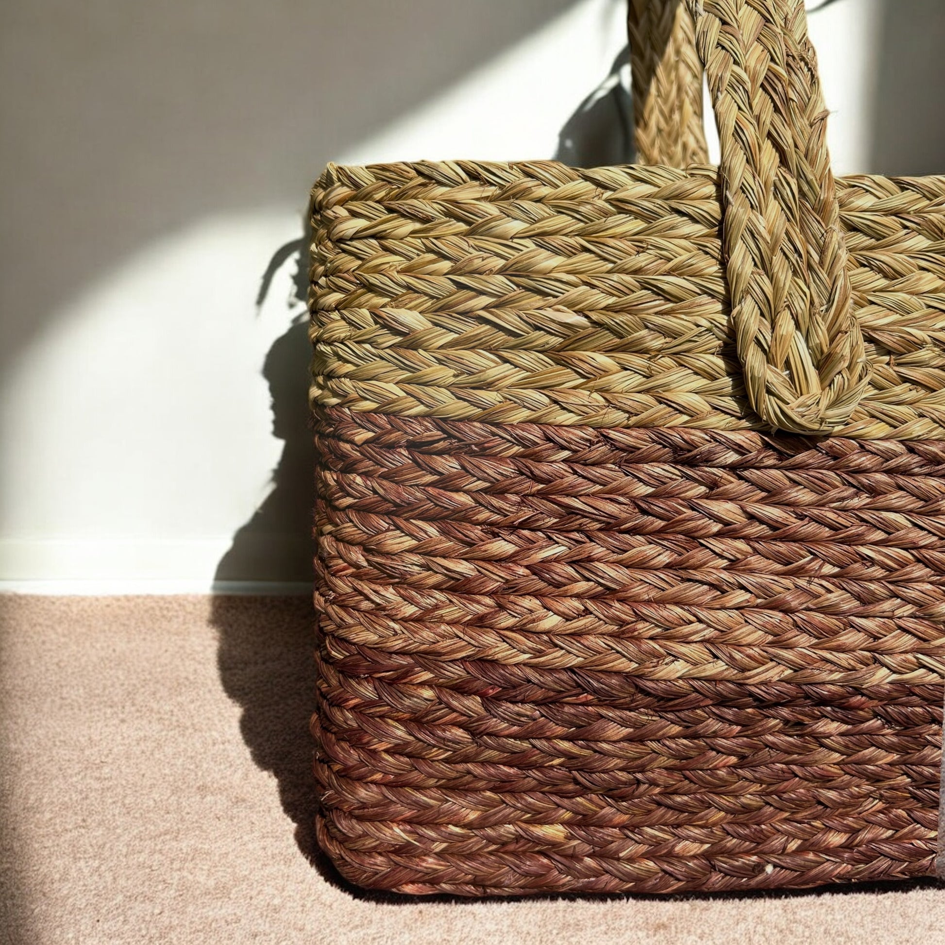 A perfect blend of style and sustainability. Expertly handcrafted by skilled artisans using durable Sabai grass, this eco-friendly bag is both sturdy and lightweight. Featuring beautiful ombre-dyed stripes, it comes in four stunning colours: Natural, Teal, Rust, and Deep Lavender. Designed for everyday use, it offers a spacious interior and strong, comfortable handles—ideal for carrying groceries, books, or daily essentials with ease.