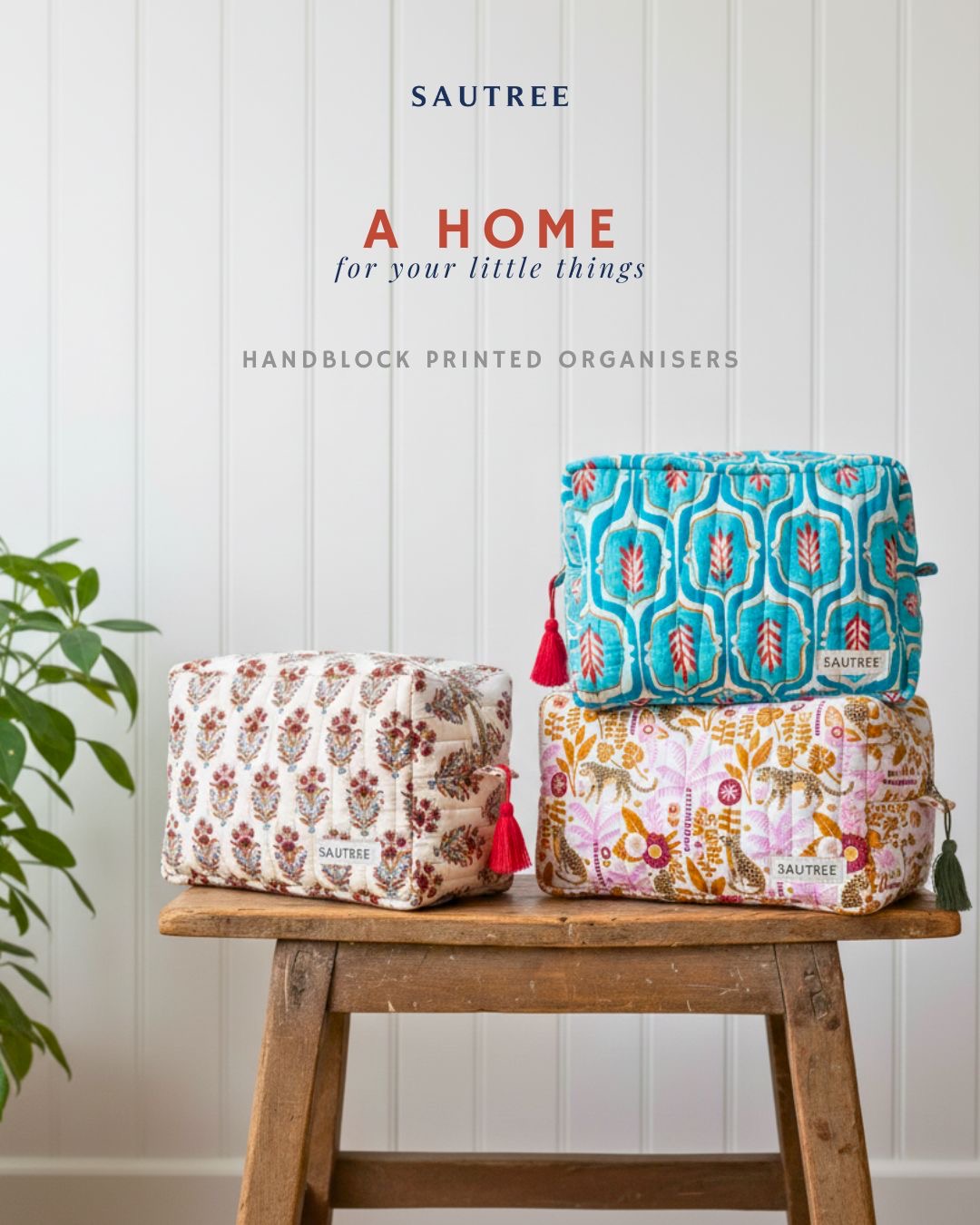 This organiser features hand screen printing, done by skilled artisans of Rajasthan, India. Made in Jaipur, the process involves using fine mesh screens and vibrant dyes to create detailed patterns on fabric, requiring precision and expert craftsmanship.
